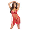 Dare to unleash all your devilish antics in this sexy baby doll set featuring sheer lace cups with a scalloped trim, adjustable spaghetti straps, loose mesh bodice with a vented open front, whimsical mesh strips, and a matching thong panty.