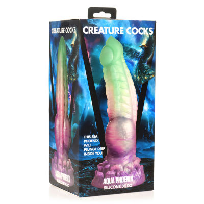 Let your mythical fantasies take flight! This unique Aqua Phoenix dies and is reborn not by fire but with the power of the churning seas! The jade green and purple dong has rows of firm, ribbed ridges along the shaft, smooth tip, round knots near the bottom of the rod and a plumage of crashing waves at the base. This meaty dong has a tapered head for easier insertion, but a girthy, thick body that will stretch your limits! Made out of premium, flexible, phthalate-free silicone, this dong is body-safe and best used with water-based lubricants only. Enjoy hands free rides due to the strong suction cup base! Invite a partner to indulge in kinky cosplay or fantasy roleplay and use their favorite harness to transform this dong into a strapon! Afterward, make sure to wash it with warm water and mild soap, then spray it with a toy cleaner and air-dry. Keep out of direct sunlight and heat.