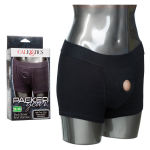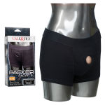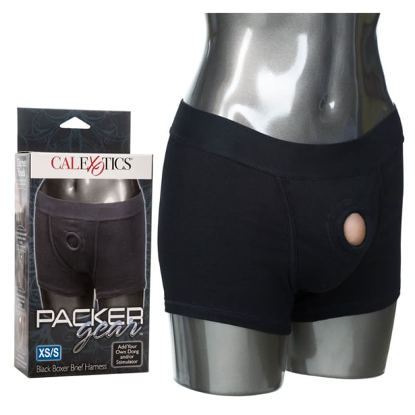 The Packer Gear Black Boxer Brief Harness is an ultra-comfortable, easy wear harness designed with powerful performance and comfort in mind. This classic harness has a supportive extra-wide waistband, soft stretchy material and internal probe straps for the ultimate support. Enjoy double penetration pleasure with the accommodating 2-panel design and unique bullet stimulation pocket. The durable, reinforced O-ring stretches to accommodate your favorite packer, vibrator or dildo.