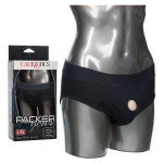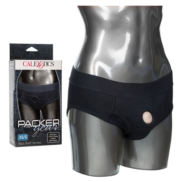 The Packer Gear Black Brief Harness is an ultra-comfortable, easy wear harness designed with powerful performance and comfort in mind. This classic harness has a supportive extra-wide waistband, soft stretchy material and internal probe straps for the ultimate support. Enjoy double penetration pleasure with the accommodating 2-panel design and unique bullet stimulation pocket. The durable, reinforced O-ring stretches to accommodate your favorite packer, vibrator or dildo.