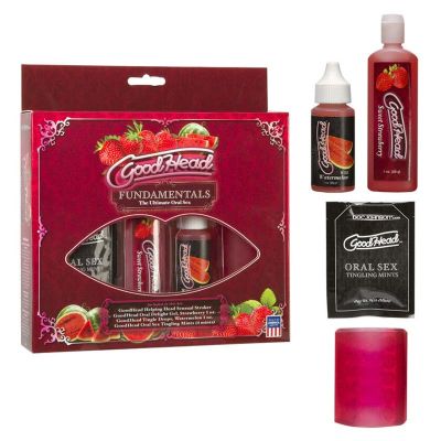 Looking for a mind- blowing experience down there? Goodhead Fundamentals provides everything you need for wonderful oral pleasure, time after time! The Sweet Strawberry- flavored Goodhead Oral Delight Gel will turn your lovers package into a sweet strawberry treat and just a few drops of the delicious Watermelon- flavored Tingle Drops will provide the most satisfying blow job experience ever! The Oral Sex Mints offer extra fresh breath and increases the receivers sensitivity with a tingling sensation while suppressing the givers gag reflex for simply amazing deep throat action! Made from our frosted, lifelike ULTRASKYN, the reversible Helping Head Stroker is 2 of super- soft and stretchy material featuring message beads on the inside to heighten pleasure during fellatio. Phthalate- free and Proudly Made in America.