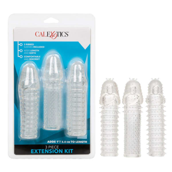 The 3 Piece Extension Kit is a set of 3 super tight, close-end extension sleeves with a ribbed texture inside and out for intense stimulation. These enlarging enhancer sleeves wrap tight to increase girth, length and explosive pleasure for everyone involved. The erotic enhancer sleeves ultra stretchy material and spacious chamber is made to fit even the biggest man.