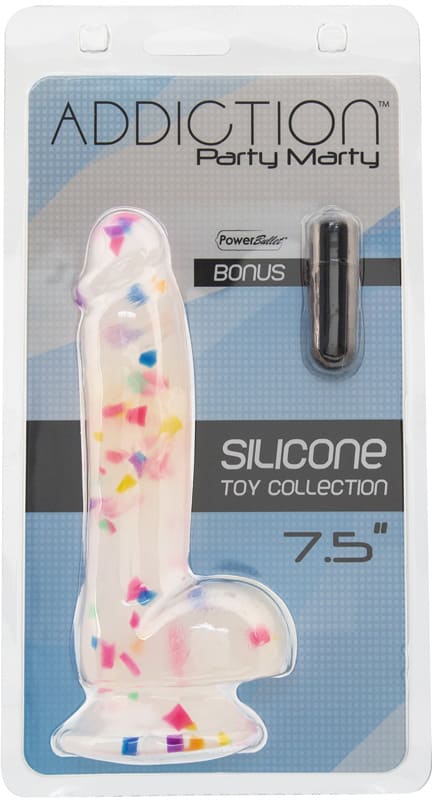 Get the party started with this frosted silicone dong with a fun rainbow confetti design, and realistic texture. This dong has a superior suction cup and is harness compatible so you can decide how you want to play.