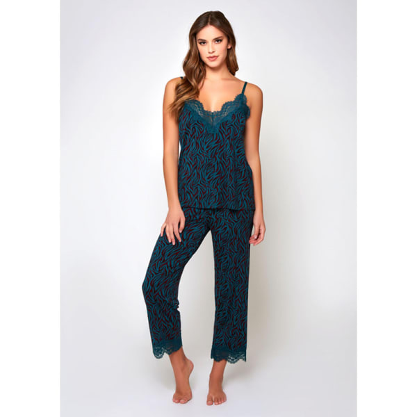 Zebra print jersey knit pajama set with lace trims and adjustable straps. Material: 95% Viscose 5% Spandex