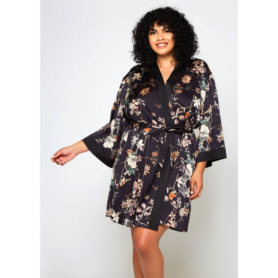Floral print stretch satin robe. Material: 95% Polyester 5% Spandex