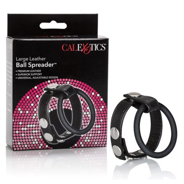 Extend your seduction and ecstasy pleasure, with the adjustable Ball Spreader. The easy to use, comfort fit strap and ring combo erection enhancer fits over the erect penis for prolonged erotic performance and intensified sensual satisfaction. Slip on the large sized strap, and adjust the steel push snaps to secure the perfect orgasmic tension, for a super-size experience every time. The enhancer comprises of a soft genuine leather strap, with steel plated snaps, and a flexible, smooth rubber ring. The erection enhancer is perfect for spontaneous, sensual exploration and instant self-gratification play. The smooth leather strap is designed to fit around the base of the scrotum, and is fully adjustable for ultimate erection support and tingling tension. The rubber ring slides over the penis to maintain performance and stamina. For increased sensitivity and maximum exotic pleasure, it is recommended that you always use a quality lube with this toy. Perfect for first time and experienced users, the enhancer can be used for solo intimacy, and couple's play arousal and stimulation. Use the large sized strap to indulge your secret fantasies and sensuous wild desires. The rubber ring provides erection support for extended rock hard satisfaction, for longer periods of time. Before and after every use, clean the leather erection enhancer and rubber ring with a toy cleaner spray.