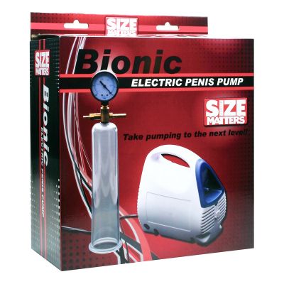 The Deluxe Electric Pump lets you take your pumping experience to the next level! It provides a continuous even flow of vacuum pressure, and its brass pressure valve allows you to adjust the intensity of the suction. The gauge allows a view of the precise pressure level for maximum control over your pumping regimen. This electric pump offers superior power and convenience over manual pumps and achieves higher levels of suction much faster. To help maintain your erection, this set includes an adjustable snap-on leather cock ring, and three different sized clear stretchy cock rings. Experience the power and convenience of the quiet and dependable Deluxe Electric Pump! Also includes one cylinder and 10 feet of tubing.