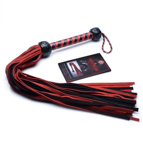 The many tails of this suede flogger will flash red and black as they impact the skin of your masochist. Each strand is supple and soft, but will land with a sting when used properly. The handle is leather tightly wrapped in an elegant black and red herringbone pattern, and features a matching leather wrist loop.