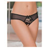 From the Booty Packs by Magic Silk collection, this 3-pack includes: One skirt with an open, moonshine back, one panty with a crotchless cutout and peek-a-boo back adorned with satin bows, and one g-string featuring dual plush elastic waistbands and satin bow accent. Soft, black floral lace paired with plush elastic. 15% Spandex / 85% nylon
