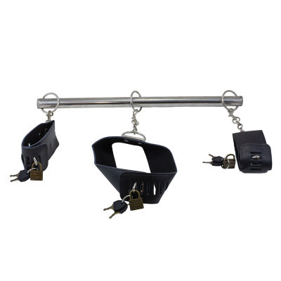 Fold your sub into a more vulnerable position with a spreader bar made for extreme restraint. Featuring a lockable wrist or ankle cuff on each side, and a neck collar in the center, your sub will have no choice but to bend to your will. Removeable clips make this restraint system universal, adjustable and perfect for your next extreme restraint play session. Comes with metal bar, 2 cuffs, 1 collar, carabiners, padlocks and keys.