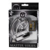 This erection inhibiting device is made of durable stainless steel and features a shortened cage with a locking base piece. Simply place him in the cage and fasten the base ring using the simple pin mechanism. The hinged base ring has a rubber sleeve at the joint to prevent pinching. Then just place the pin through the top of the cage and secure him with the included lock and keys. You decide when he is free...