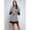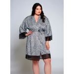 Leopard print robe with lace trim and waist tie. Material: 100% Polyester