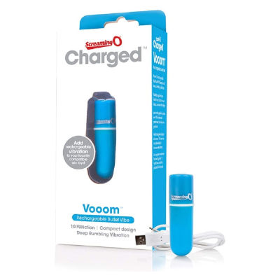 Enjoy powerful portable vibration with Charged Vooom, a unique 100% waterproof bullet vibe equipped with a 10-function motor that hums at a frequency unlike anything you've ever felt! Its sleek shape means it also can fit most existing Screaming O products and give them an intense power boost. At its highest speed, Charged Vooom vibrates for more than 60 minutes and recharges easily with a convenient USB connector (included) that plugs in securely and stays put for the duration of the charge