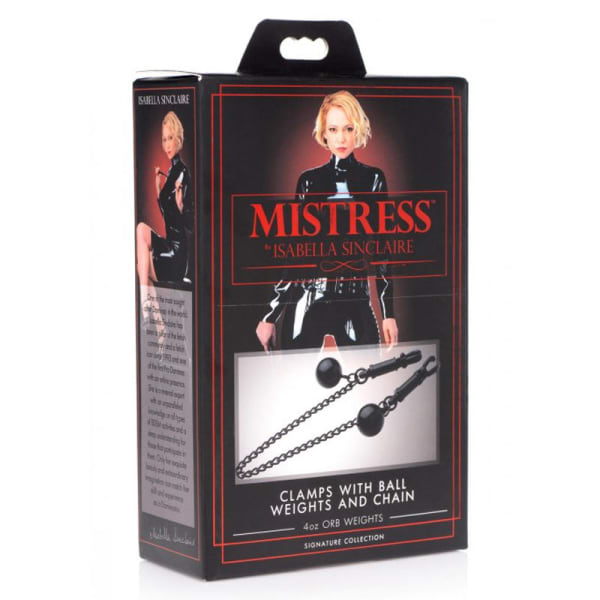 These sadistic clamps offer the framework for a wide array of pleasure play. Featuring 4 ounce dangling weights and a tuggable chain, these clamps are perfect for creating the nipple sensation play you crave. The clamps are highly adjustable via the twisting barrels. No forgiving spring loaded clamps here! Just screw down tight for unrelenting pressure. Rubber-coated tips ensure a good grip and add comfort.