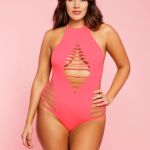 Seamless teddy with halter tie and shredded front keyhole, side and back panels.