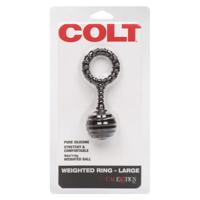 The erotic sex toy innovators at CalExotics and the male-centric pleasure experts at Colt have partnered to create a line of sex toys for men dedicated to the masculine pleasure seeker. Whether you're a bashful beginner or an erotic expert, Colt's Weighted Ring is here to help you enhance your adventurous side. The sensationally weighted ball is connected to the stretchy, durable silicone cock ring covered in row after row of thrilling ridges. Our versatile penis ring is superb for everyone at any level of pleasure and those looking to length their pleasure tool. The comfortable male cock ring can be worn to effortlessly increase length or to turn up the heat with the erotic enhancement holding you tightly. The non-porous, hypoallergenic material pairs perfectly with your favorite water-based lubricants. Available in large. COLT Studio Group shares its unique vision of the masculine man with the world through photographic, film, video and a wide variety of all-male products. COLT Studio Group celebrates the erotic appeal of masculinity. The most trusted name in all-male erotic products is COLT. If the Look is Masculine, the name is COLT! Measurements1.25" / 3.25cm (Ring Diameter)