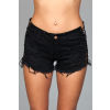 Features: Denim shorts with lace up side details and distressed details on front and back - button and zipper closure.