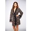 Printed rayon challis lounge robe with ruffle bell sleeves and waist tie.