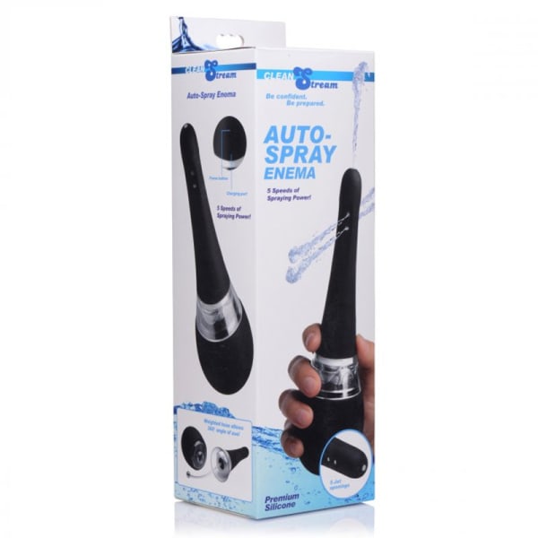 Cleaning out just got a little easier... and a little more fun! This automatic enema features 5 speeds of spraying power, all controlled with the push of a button. A total of 5 jet openings on the top and sides of the nozzle will squirt your walls with your solution of choice, with the added feature of a no-backflow design. The weighted internal hose allows for 360 degrees of use in any position. This enema is both rechargeable and waterproof for your convenience.