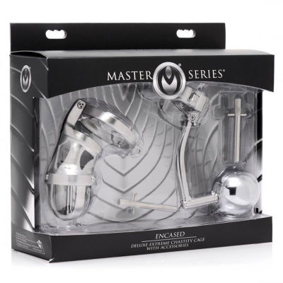 The Deluxe Extreme Chastity Cage combines the power of chastity with the stimulation of a ball restraint, anal plug and urethral sound. The sensation of being teased but unable to become fully erect in and of itself can be exciting for both partners. The Deluxe Extreme Chastity Cage allows you to include a few more devices into the mix, creating a new level of cock and ball play. The Deluxe Chastity Cage can become a complete CBT system when you include the ball restraint, urethral insert, and anal plug. You can use the chastity cage with any, all, or none of these extras, but by combining them you create the ultimate chastity device that keeps the most private areas of your partner filled, locked, and under your total control. This chastity device is the most versatile on the market, and the gently glowing brushed steel gives the deluxe cage a distinct presentation. For a smaller ball, you may purchase The Anal Intruder (sold separately). The ball of the anal intruder (measuring 1.25" in width) easily unscrews and is compatible with the Deluxe Chastity Cage.