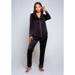 Soft stretch satin pipping notch collar with chest pocket and matching sleep pants with pockets Material: 95% Polyester 5% Spandex