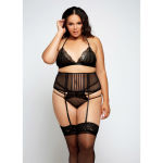 Soft cup eyelash lace bralette with halter tie, slifer back closure, mesh waist cincher with stripe mesh panel, criss cross trim, removable garters, lace up back closure and matching strappy mesh g-string.