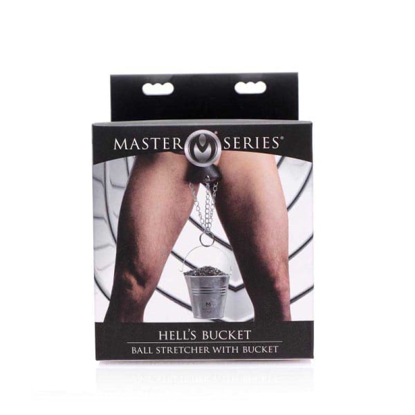 Weigh down that ballsack one pebble, coin, or drop of water at a time! Screw with your playthings body and mind when you wrap their scrotum in this leather-like parachute and hang a bucket from the three chains. CBT enthusiasts will love the customized sensations as you get creative, filling the Master Series bucket with anything your wicked mind desires. How much can your masochist handle? Find out with this durable design, or remove the bucket and attach a leash or other BDSM accessory for even more versatility.