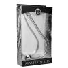 This impressive steel hook can be hooked up to ropes and other bondage equipment, making sure it keeps a strong hold on its wearer. There's 5" of insertable length (the ball and a portion of the hook). The hook then rests against the back, while the ring (1.5" in diameter) is used to connect to ropes.