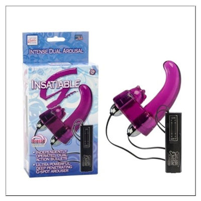 The high quality Silicone Insatiable G is an ultra powerful 7-function dual vibrating G-spot arouser with clitoral pleasure nodes and a flickering tongue designed to hit the mark with unparalleled precision! The 3.5" long perfectly curved G-spot stimulator has diameters up to 1.25". The twin bullets are 2.25" x 1". The controller with non-slip touch pads has seven functions of vibration, pulsation, and escalation for each bullet. Three AA sizes batteries, not included, provide the powerful action so you can have almighty orgasms over and over again!
