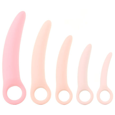 In super-smooth silicone, each Dilator curves naturally forward, aligning easily with the contours of the female body. Starting off very slim .5" (1.25cm) wide and barely longer than a baby finger at 3" (7.5cm), the five sizes increase up to the largest 5.5" (14cm) version. Regardless of which is in use, the Dilator's sleek shape widens very gently toward a ringed handle- slip a favorite bullet vibe through the loop if desired.