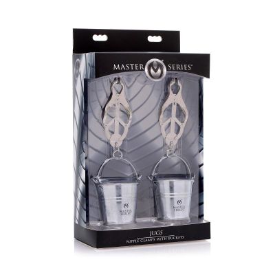Put your submissive or slave through a unique torment with a set of nipple clamps that allow you to add weight in an unusual way! In the style of butterfly clamps, or clover clamps, these attractive pincers get tighter as they are pulled. Rubber tips ensure that all pain is in the form of pleasure and that they maintain their grip. To add weight, simply fill the small, hanging buckets with water, lube, sand, stones, or whatever your devious mind can come up with. You will love watching your plaything carry the buckets around by their tits!