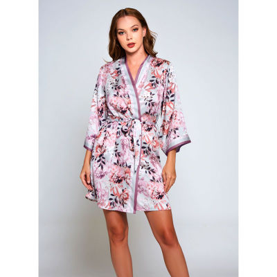 3/4 sleeve satin robe with stripe trim Material: 98% Polyester 2% Spandex