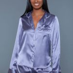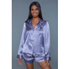 Features: 2 piece satin pajama set . Long sleeves top and shorts with silver piping.