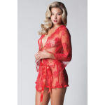 Sheer lace robe with scallop edge trim, butterfly sleeves and satin tie sash.