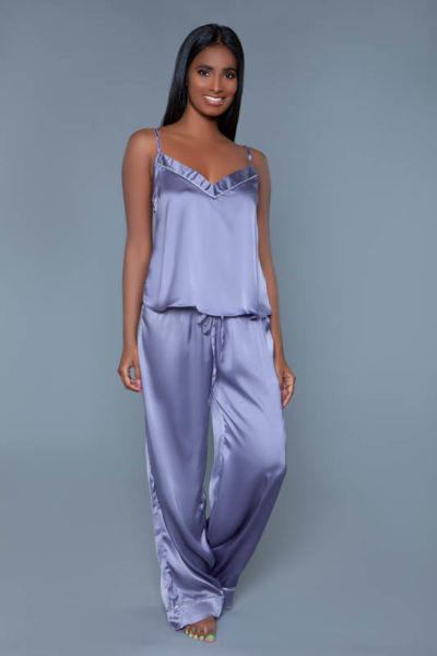 Features: 2 pc satin pajama set. Adjustable cami straps and pajama with silver piping.
