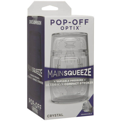 See yourself in a whole new way. This addition to the Optix category of Main Squeeze variable- pressure strokers features the collections unique completely transparent design that leaves nothing to the imagination, in a scaled- down size that fits in the palm of your hand. Pop- Offs hard plastic case and tight, textured ULTRASKYN insert offer the same visually stimulating experience and squeezable, tightness- controlling grip as the original in a discreet compact size.