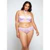 Galloon lace and mesh longline bra with lace choker, satin padded cups, center front keyhole, and hook and eye closure and matching mesh hipster panty with keyhole back.