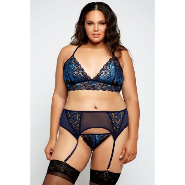 Soft cup cross dyed galloon lace bralette set with keyhole back, criss cross back, matching garter belt and g-tring with garters.