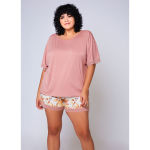 Soft pj set wuth solid top with lace trim at sleeves and printed leaves shorts with lace trim. Material: TOP s 95 % viscose 5% spandex, Bottom is 100% viscose