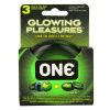 ONE Glowing Pleasures condoms glow in the dark! Expose to light for 30 seconds for up to half an hour of glow-in-the-dark fun. Glowing Pleasures glow-in-the-dark condoms are made using non-toxic phosphorous pigment layered between thin layers of latex. Intended and safe for intercourse. Standard sized. Pack of 3.