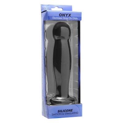 The Onyx Silicone Electro Strap On Dildo by Zeus is amply sized to satisfy your need for a fulfilling electro adventure! Perfect for the daring novice or seasoned users alike. Made of premium silicone, it features a bulbous tip and flared base, ideal for use in most strap-on systems. Once inserted, electro stimulation will flow from one conduction pad to the other. Simply plug into any Zeus Electrosex Power Box, sold separately. The leads attach to the sides, rather than the base, to ensure they will not get in your way. The electro wires fit nicely outside of O-ring connectors.