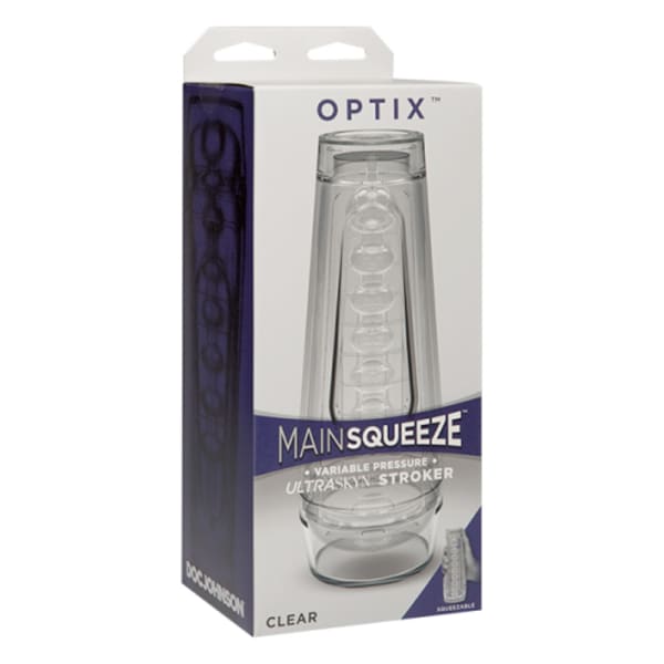 See yourself in a whole new way. The innovative Optix model joins Doc Johnsons Main Squeeze line of variable- pressure hard case masturbators and features a unique completely transparent design that leaves nothing to the imagination. Each part of Optix including the case, adjustable pleasure features, and tight, textured ULTRASKYN tunnel is crystal clear, offering an unmatched visually stimulating experience.