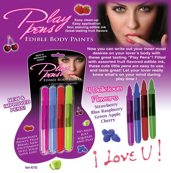Now you can write out your inner most desires on your lover's body with these great tasting "Play Pens"! Filled with assorted fruit flavored edible ink, these cute little pens are easy to use, and taste great! Let your lover really know what's on your mind during play time!