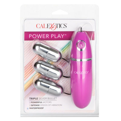 Three vibrating bullets means three times the fun and three times the pleasure. Lay back and let yourself be engulfed by powerful waves of vibrating pleasure from three directions. The power play triple silver bullet is perfect for both solo and partnered play. Explore yourself with one, two, or all three bullets at once and get ready to transport yourself to a place of unbelievable ecstasy. No longer do you have to choose between full coverage feeling and the heavenly experience of pinpoint-precise bullet vibrations. Lay one on your clit, another on your lips, and let the last one explore those super-sensitive anal nerve endingsor any other combination you crave. Each spot will benefit from the explosion of centralized pleasure that bullet vibes are famous for, but you'll get three times the ecstasy (and be tempted to go for three times the orgasms) with this chic and sensual massager. Each bullet is 2.25 inches long by 1-inch-wide, making the triple silver bullet the perfect size to slip into your purse for fun at any time. It's entirely waterproof for fun in the tub, the shower, or anywhere else you can imagine. The triple silver bullet is packed with 3intense speeds of vibration that radiate from each individual bullet, ready to please you exactly as you crave. The ergonomically curved controller makes switching speeds easy and downright luxurious. The triple silver bullet is sensual, chic, and glam all rolled into oneso what are you waiting for? Slip in 4 AAA batteries and get ready to be whisked away on a breeze of bliss.