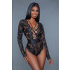 Features: 1 piece long sleeves sheer-lace with plunging neckline and elasticated waist. Multiple straps embellished in gold rings.