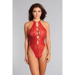 Features: French cut halterneck lace teddy with criss-cross front detail and thong back.