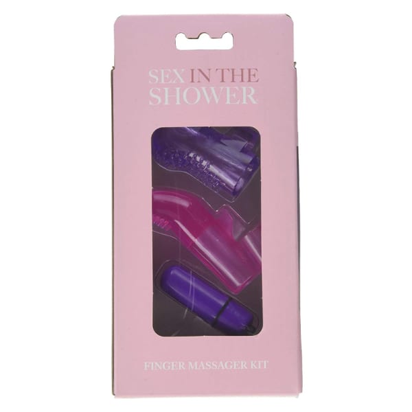 Sportsheets Sex In The Shower Finger Massager Kit. Turn your fingers into something magical. Gently, or not, caress your partners' erogenous zones. Tickle and tease your partner into submission. Feel the inner beatings of their passion. Materials Thermoplastic Elastomers TPE sleeves, ABS plastic vibrating bullet. Includes pink sleeve length 3 inches, width 1 inch. Purple sleeve length 2.25 inches, width 1 inch. 1 mini bullet vibrator requires 3 AG13/LR44 batteries, included. Remove protective tab before use. How to use: open bullet and remove battery protector. Place bullet in sleeve and finger in loop. Caress your partner's erogenous zones. Change out sleeves to tickle and tease. Cleaning: to clean the H20 Resistant Massager, first separate sleeve from bullet vibrator. Simply use antibacterial soap and clean the product under hot water