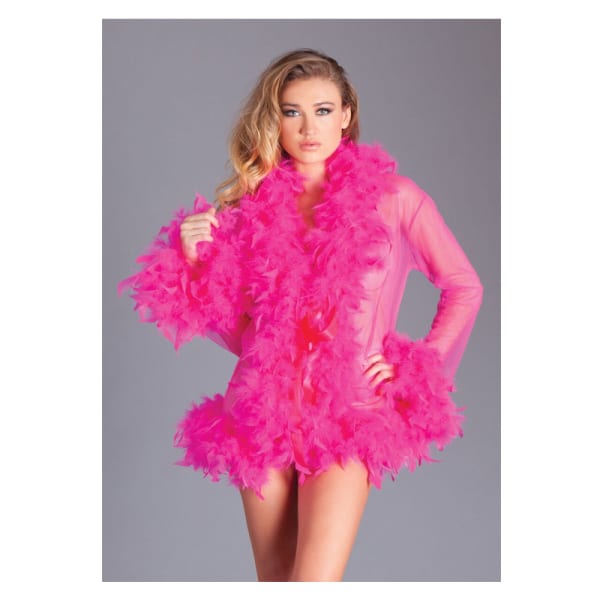 Features: Feel spoiled in this gorgeous sheer feather trim robe, not only does it add an air of importance is looks breathtaking. If you love to feel spoiled and love looking classy this robe is for you. Wear this feather trim robe over your most intimate outfits or alone, its sheer enough to show off your best assets while still adding an air of mystery. Sheer short length robe with chandelle boa feather trim. (Thong not included).