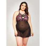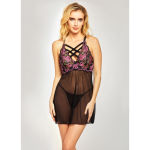 Soft cup babydoll with novelty elastic strap detail with hook and eye closure and matching g-string.