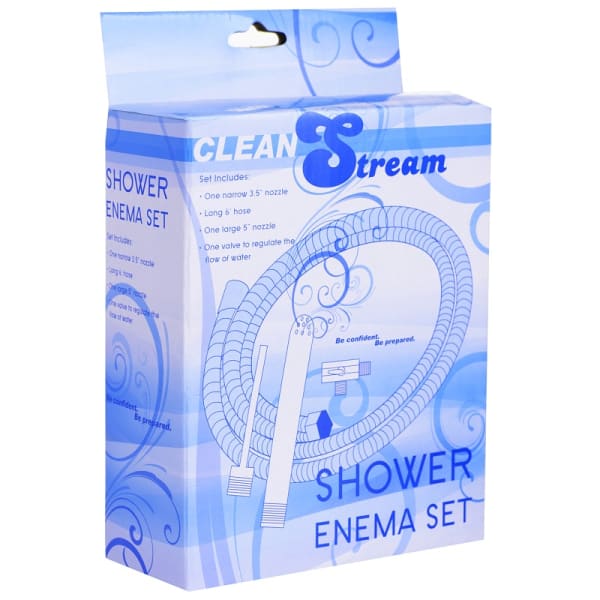 This is a very neat enema system. Its douche/enema nozzle is outfitted for use as a shower attachment. The Shower Enema Kit comes with two nozzles, one is 5" and the other is 3.5". It also comes with a 6ft (2m) metal hose. One end of the hose screws into your shower, the other end is where you attach your choice of nozzle. Where the Shower Enema Kit connects with your shower it has a valve that directs the water either through the nozzle and into you or to the shower head.